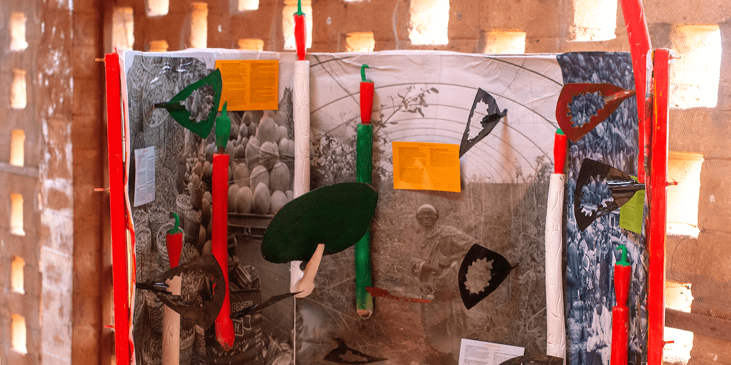 As his residency concluded, Olufela hosted Hoe Courtyard on October 3rd, 2025, welcoming fellow residents, G.A.S. staff, members of the local community, and collaborators who had contributed to his research. The event centred around a site-specific exhibition in which farm tools, market imagery and poetry were transformed into interactive sculptures. The installations spread throughout the Farm House’s living room and hallways, creating an immersive environment of sound, poetry, and tactile engagement, inviting guests to explore the complex relationships between sustenance, labour, and cultural memory.
