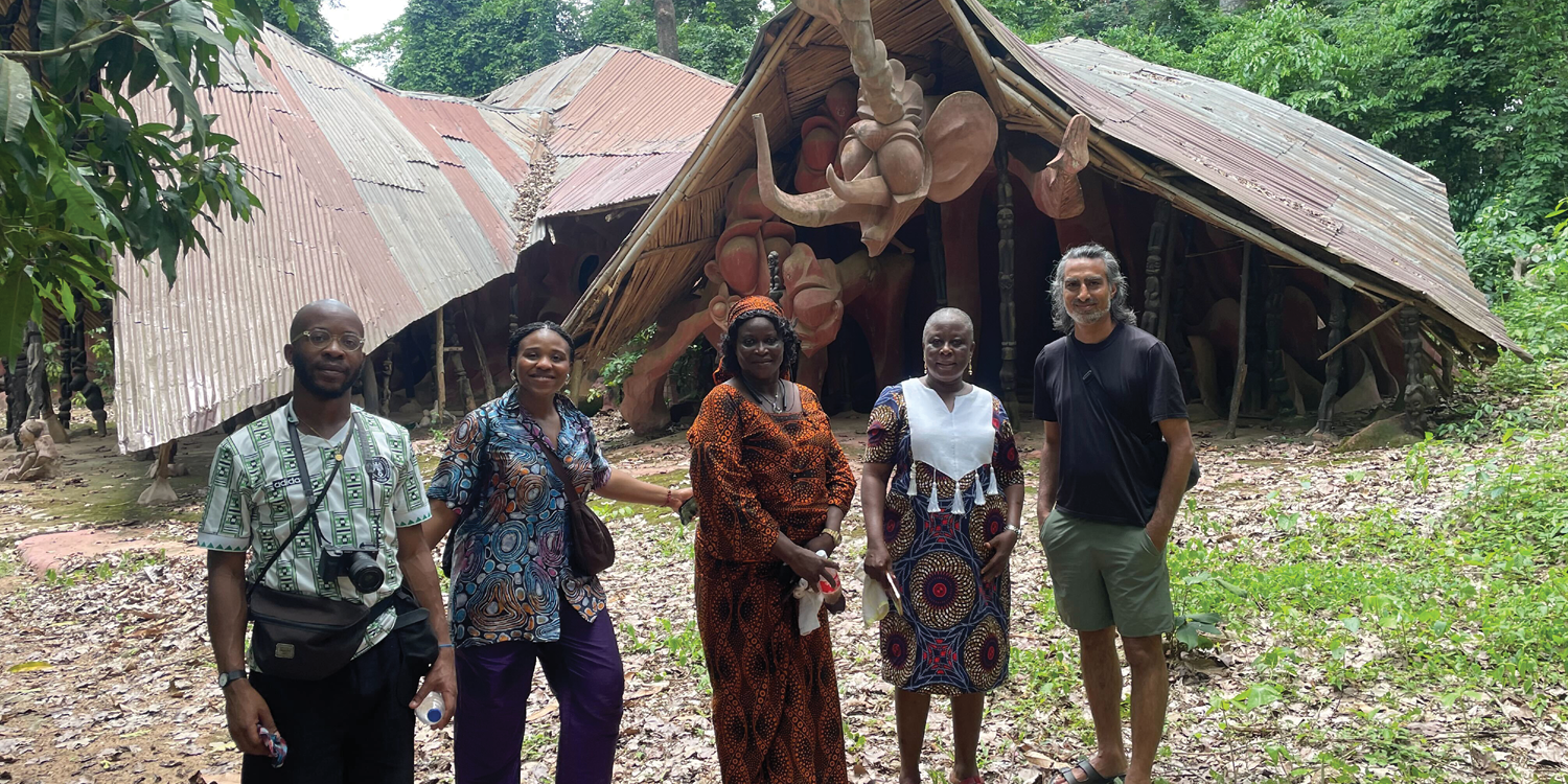 Lukman, Semilore, and Kush with their tour guides on the site of the second palace of the Ataoja of Oshogbo, at the Osun Oshogbo Sacred Grove.