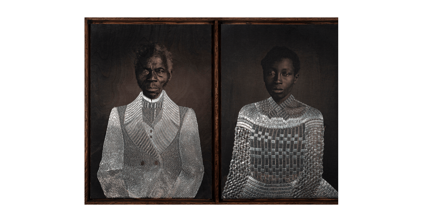 Sasha Huber, Tailoring Freedom - Renty & Delia, 2021. Metal staples on photograph on wood, 97 x 69 cm. Courtesy the artist and Tamara Lanier. Photo: Vesa aaltonen.