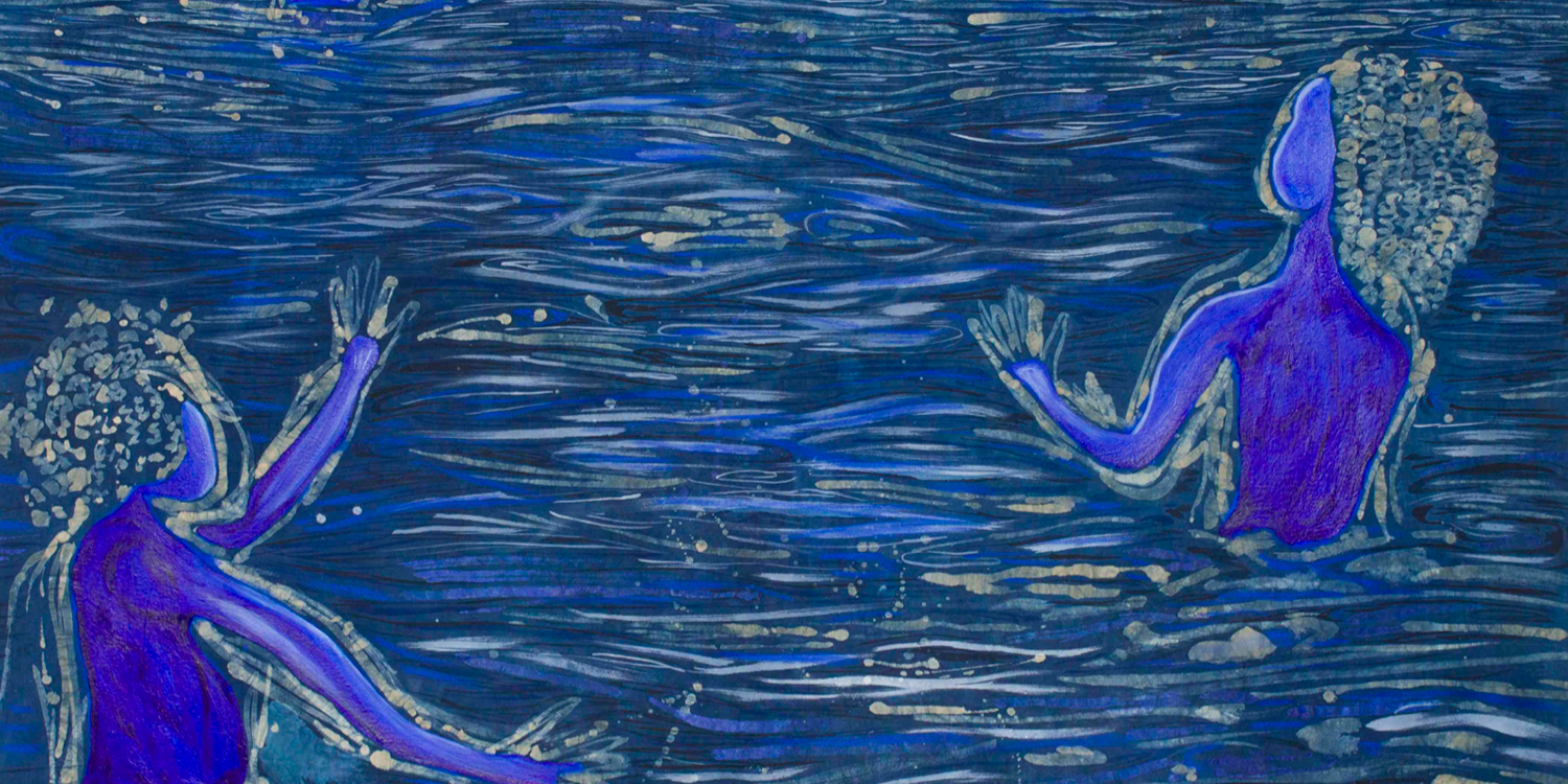 Faithful Leap, 2025. Indigo, batik, oil, glass beads on canvas (cropped). Image courtesy of the artist.