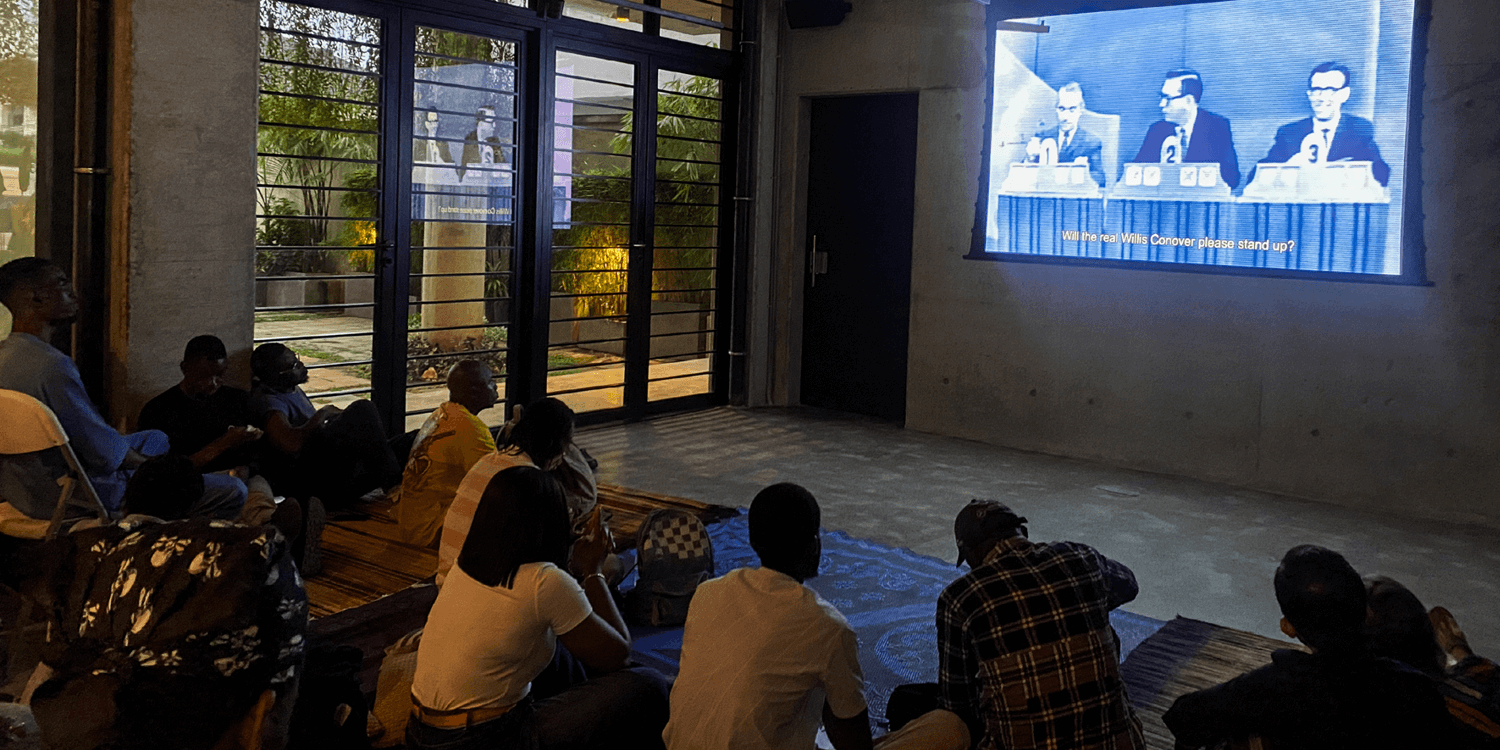 Guests watching Johan Grimonprez's Soundtrack to a Coup d’État at Open House.