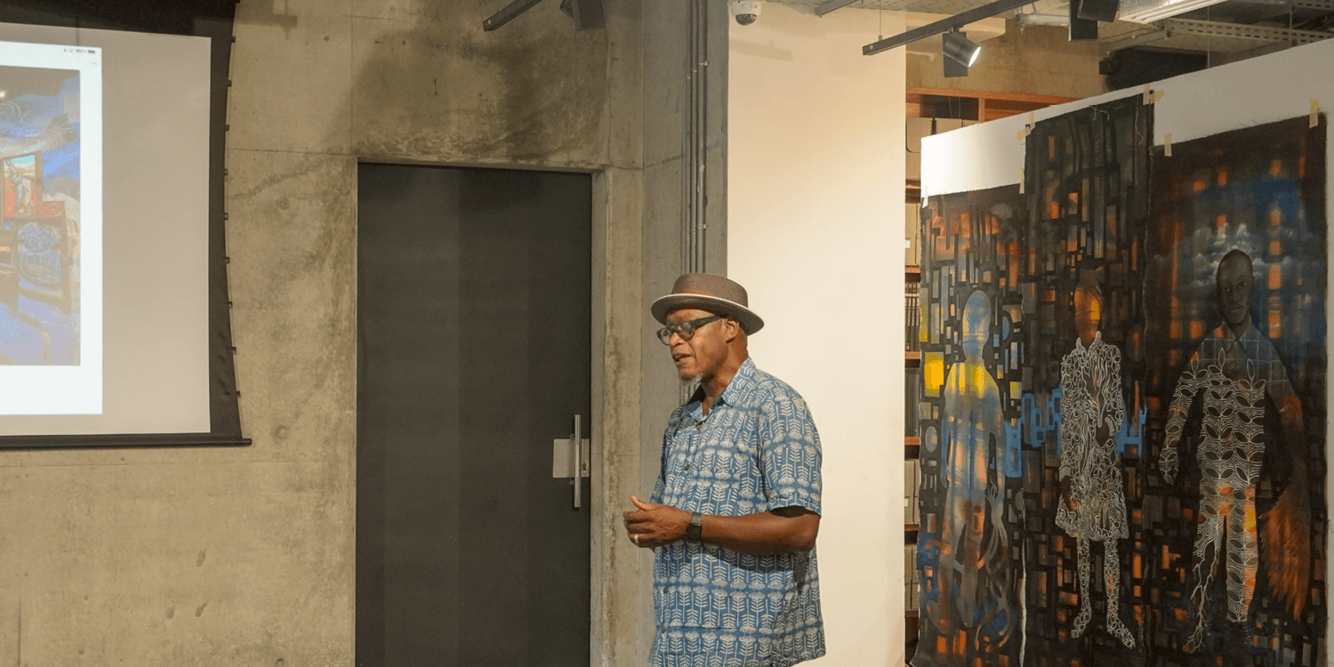 The evening opened with a presentation in which Daniel introduced his artistic practice through a slideshow of selected works. He reflected on a practice that explores themes of displacement and diaspora, spirituality, and the reimagining of home, as well as his richly textured bas-relief and mixed-media assemblages, which incorporate materials such as metal, wood, twine, and clay to construct an iconography of the Afro-Atlantic experience.