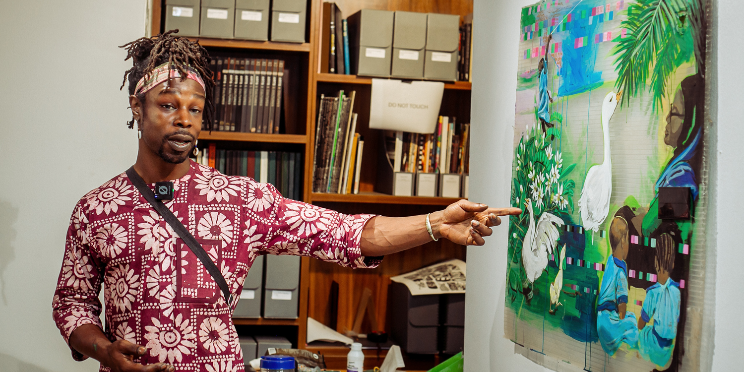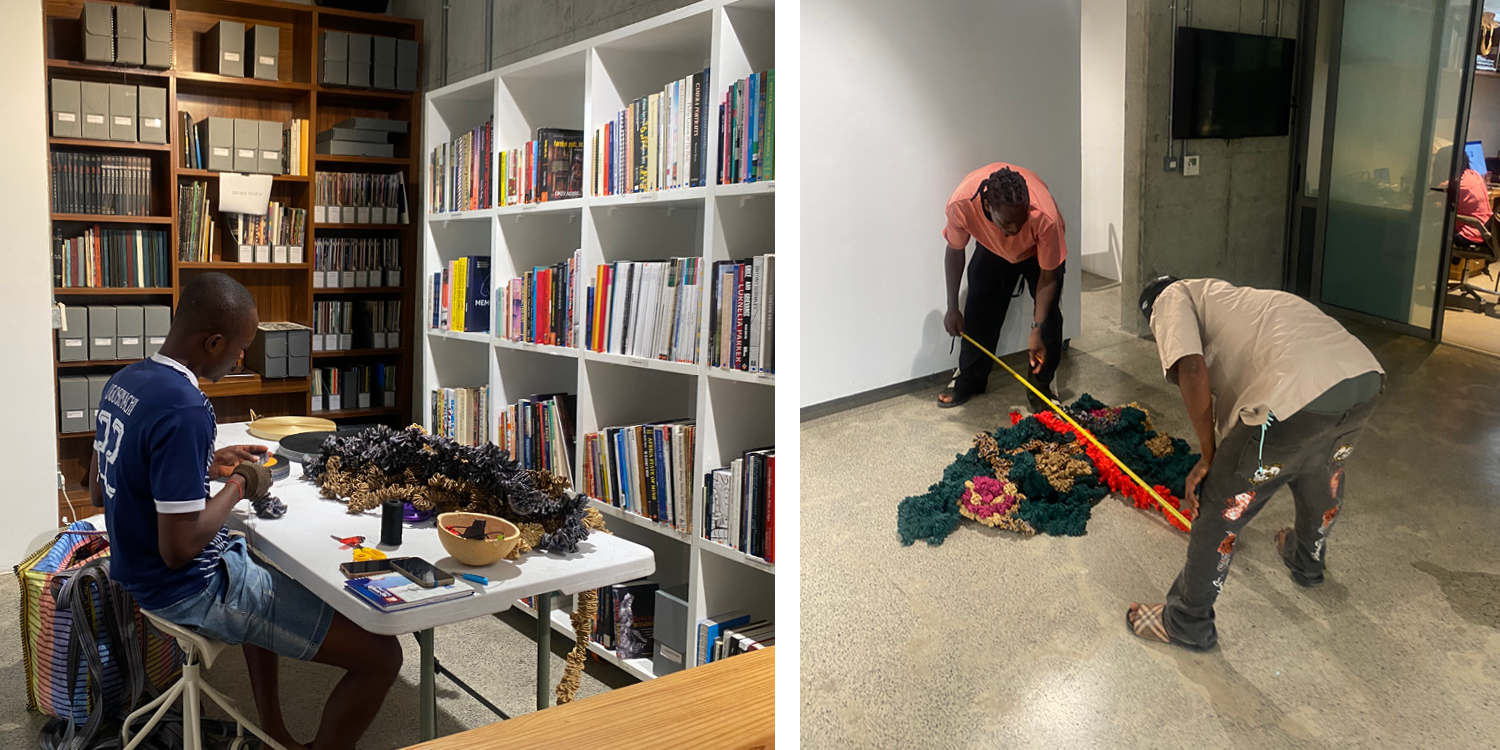 Nduka Ikechukwu experimenting with fabrics in the studio during his residency.