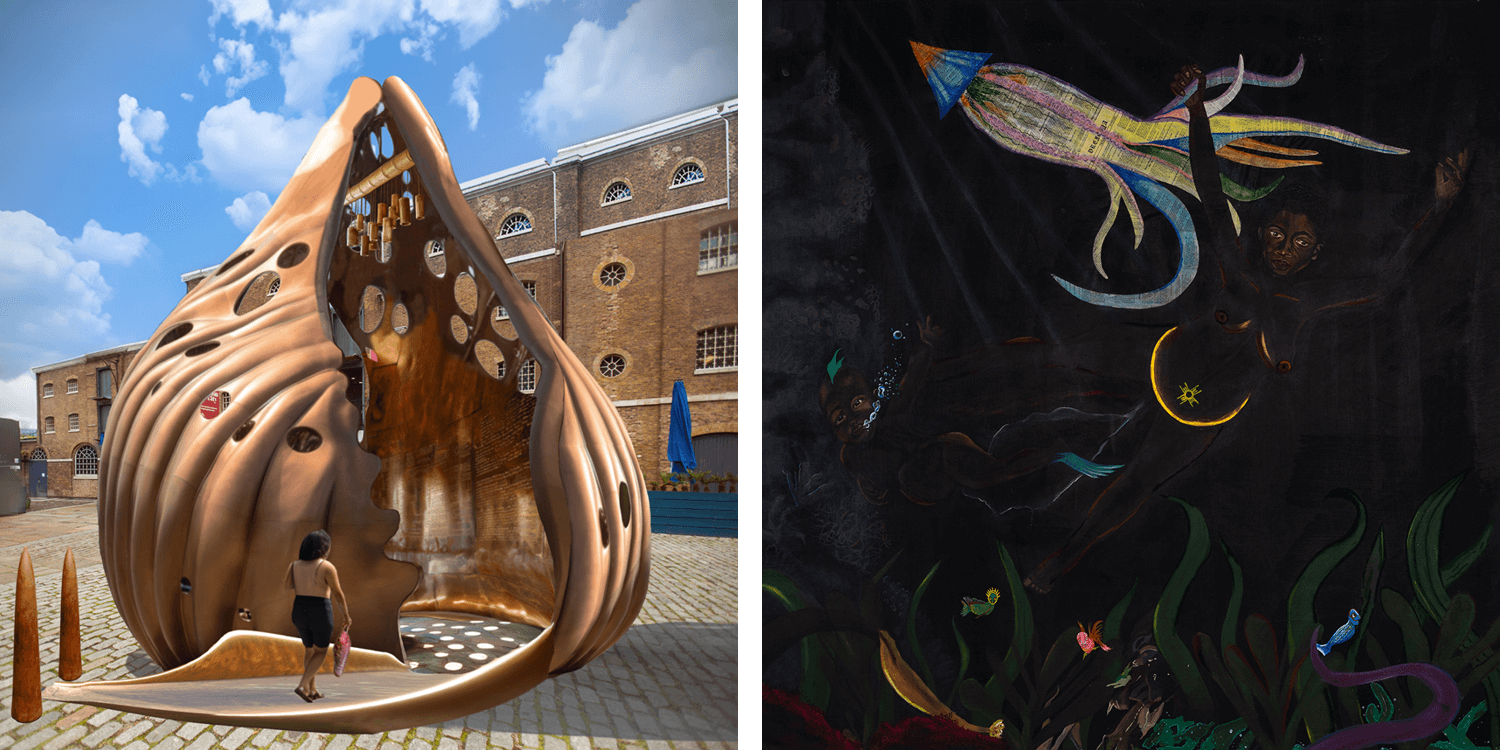 (L) The Wake, bronze. Memorial to the victims of the Transatlantic Slave Trade. Scheduled unveiling at the Museum of London Docklands, 2026. Image courtesy of the artist. (R) Drexciya, 2021. Acrylic, pastel and parchment on canvas, 195.6 × 195.6 cm. Image: Pete Carr.