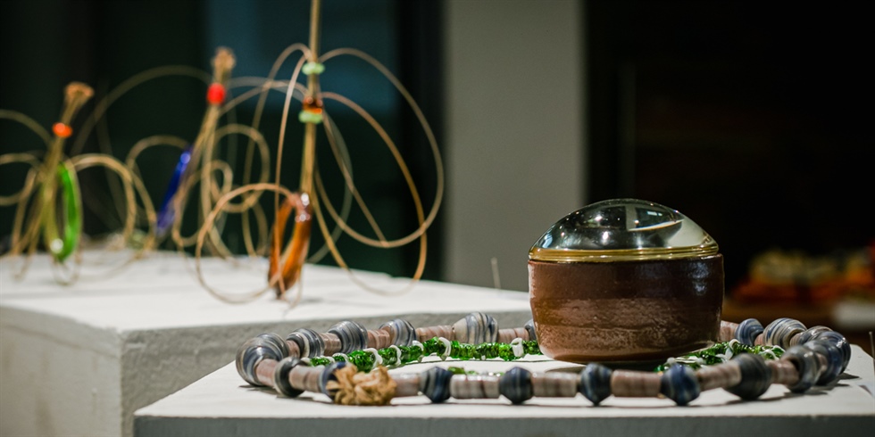 Glass pieces from Bida, Niger state, crafted by Masagá glassmakers presented alongside glass sculptures created by Graeme during his residency.