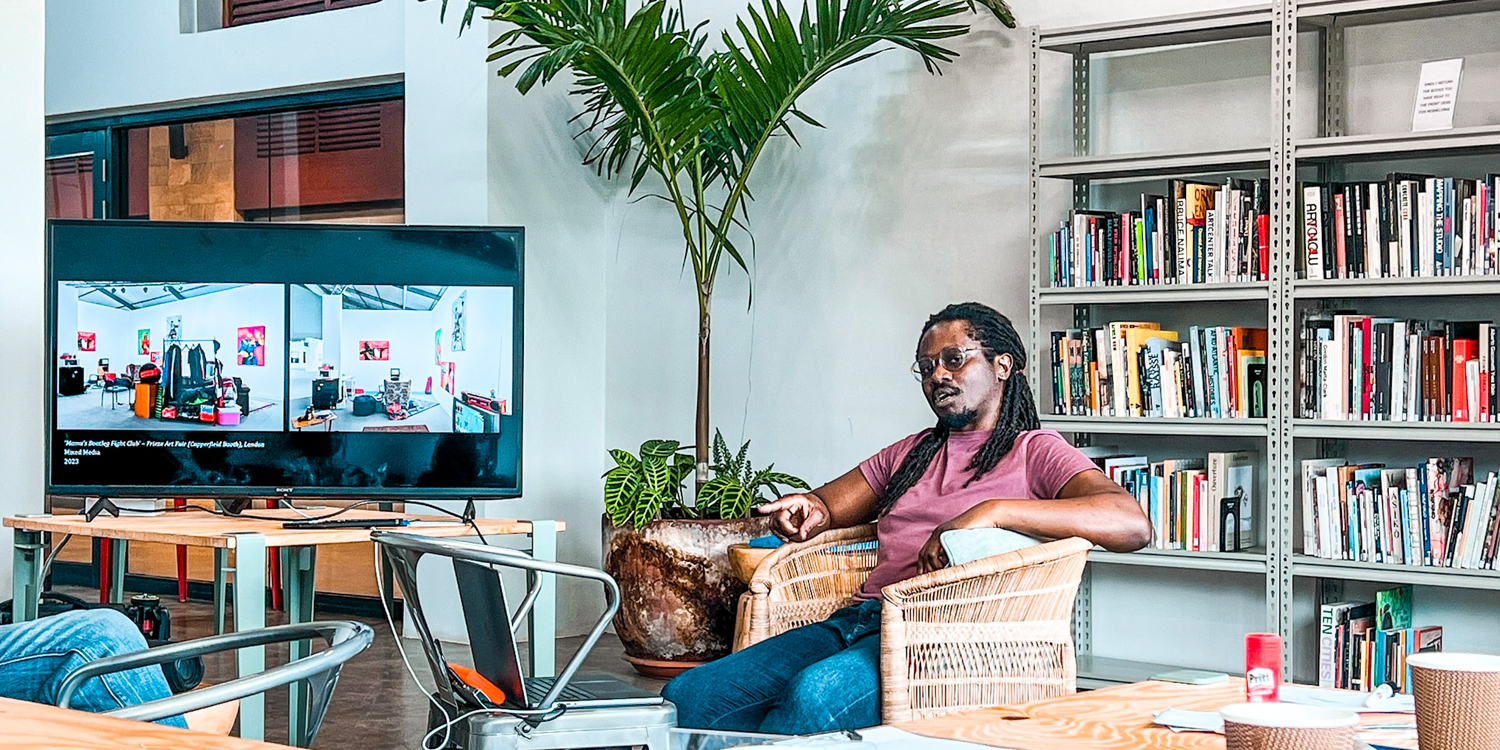 Achiampong’s facilitation balanced theoretical exploration and practical engagement. The workshops emphasised approaches to studio practice inspired by Achiampong’s focus on the Black experience, speculative worldbuilding, migration, and belonging in contemporary sociopolitical contexts. Participants engaged in skill-sharing exercises explored strategies for utilising the internet as a creative tool and examined methods for knowledge production and ecosystem building.